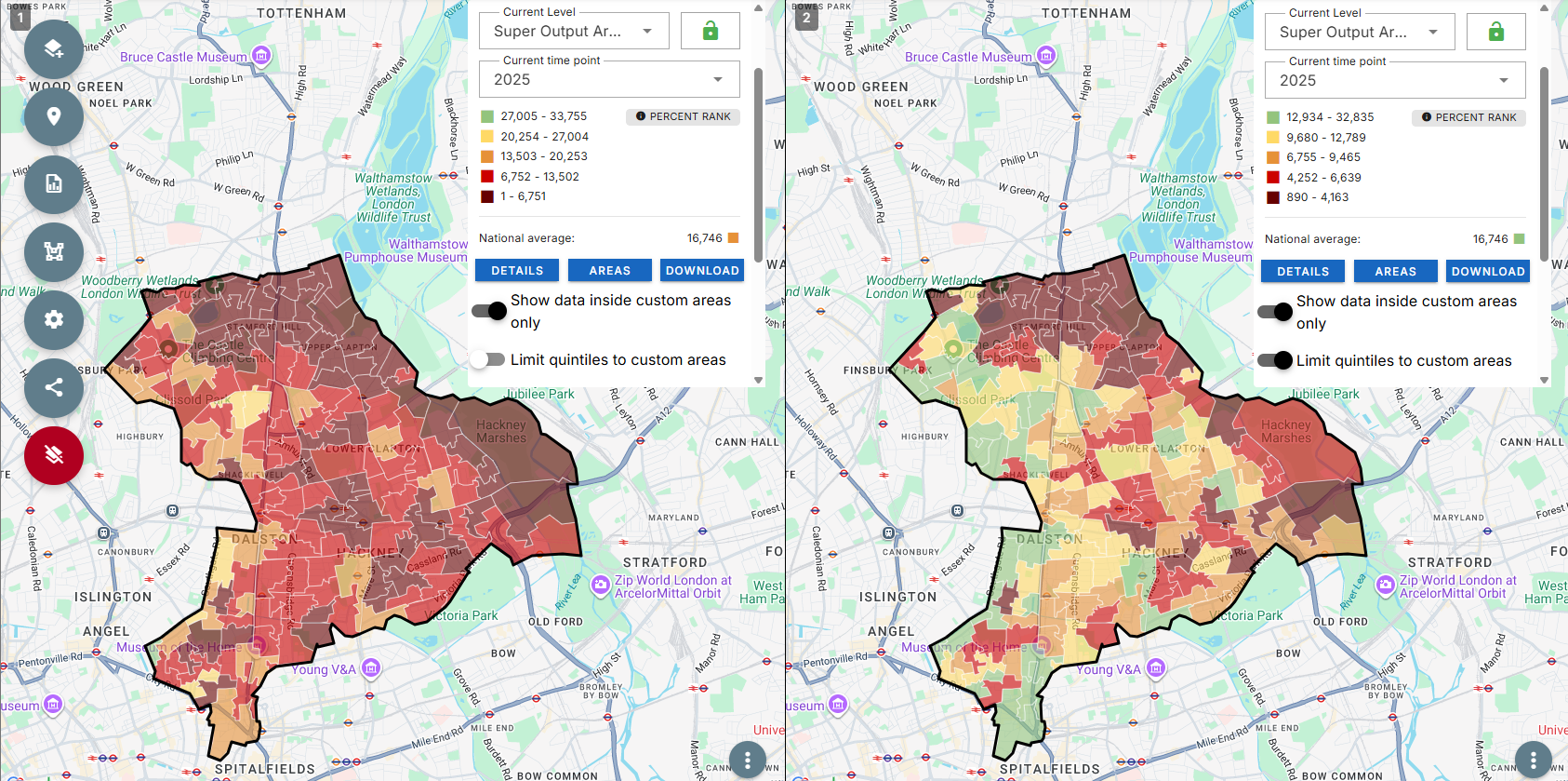 With the new toggle for local quintiles, we hope to change that. Local quintiles work in the same way as national ones, but with a key difference: instead of splitting data into five groups across the whole country, they are calculated using only the areas you have selected on the map.