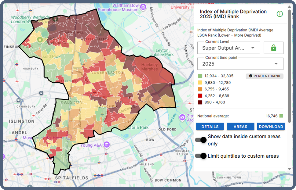 Using local quintiles fits naturally into your existing workflow. For example, if you are analysing deprivation across LSOAs in a single local authority, start by adding your custom areas to the map. Then switch on “Show data inside custom areas only” with “Limit quantiles to custom areas” enabled.