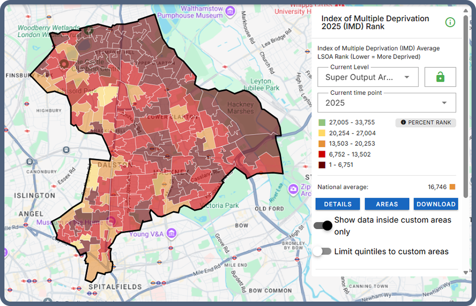 For example, taking a look at the IMD for Hackney below, we can see that many LSOAs rank in the 20% most deprived nationally.