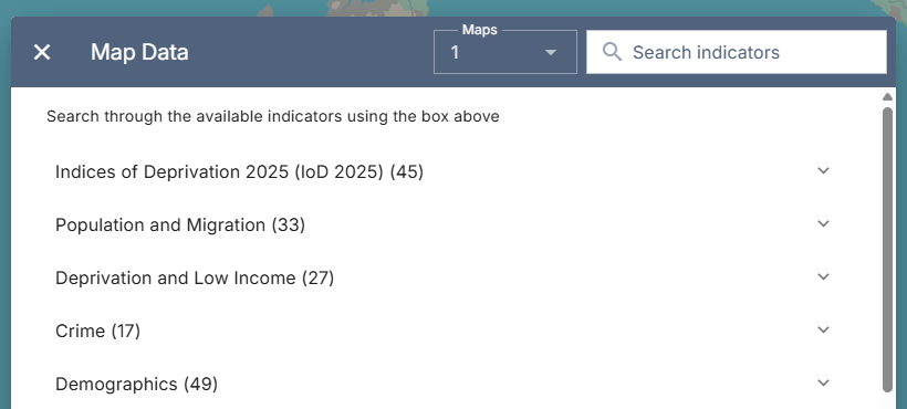 Once you’ve chosen to view more than one map via this dropdown, pick the indicators you’d like to view. For Pride in Place analysis, you’ll want to explore the Community Needs Index 2023, and the Index of Multiple Deprivation 2019 – as detailed within the methodology published by the Ministry for Housing, Communities and Local Government here.