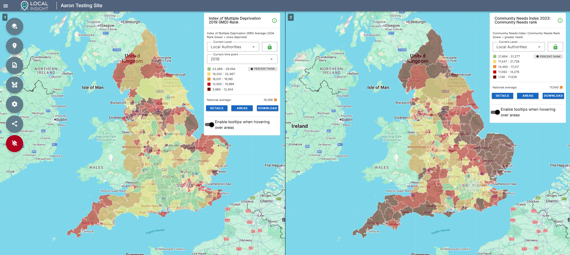 With the opportunity to visually compare and analyse two areas at once, we can better spot areas facing multiple challenges. For example, we can now examine both the Index of Multiple Deprivation and the Community Needs Index at the same time on the Local Insight map – enabling analysis that showcases why areas may have received Pride in Place funding.